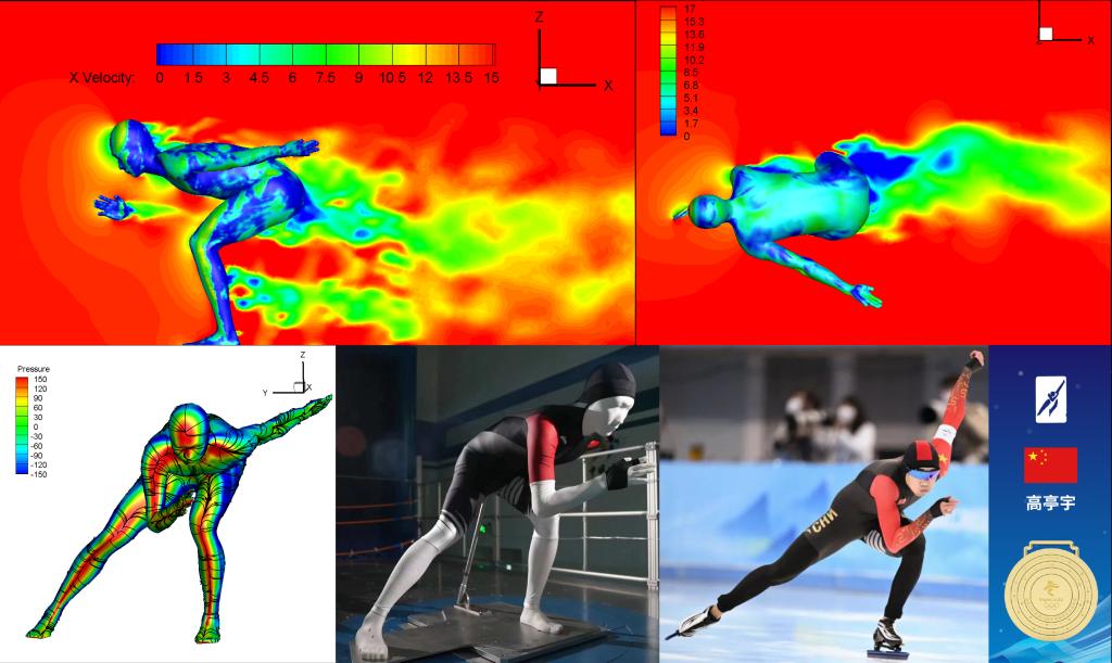 自2019年起,郑伟涛教授团队的20余名师生参与研究,对速度滑冰运动员高亭宇等进行了典型运动姿态实体扫描,采用逆向工程对于不同姿态、不同速度下竞速类项目运动员展开建模。面对数以千万计的网格模型,团队每次都要进行上百个小时的数值计算,精准确定空气阻力来源与占比,聚焦阻力集中部位,多次进行计算优化减阻方案,并开展风洞试验。一系列研究为竞速类服装减阻结构、面料、版型等设计提供科学依据,最终实现减阻率5-10%的效果。