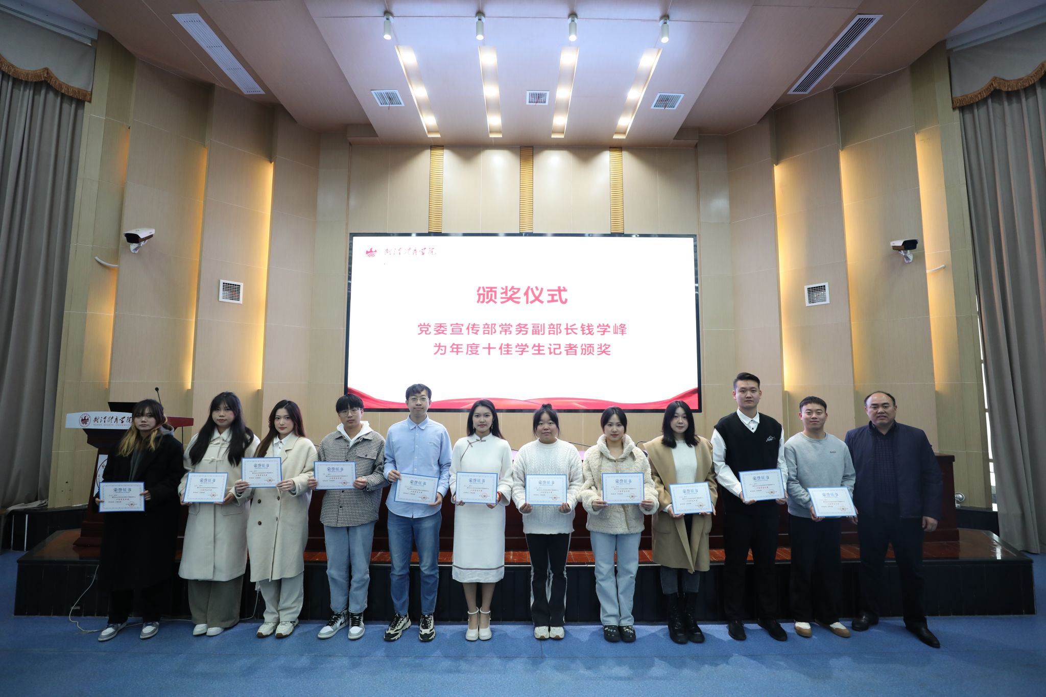 党委宣传部负责人宣读聘任决定与表彰决定,并为年度十佳学生记者颁发奖项,为2022-2023届新闻中心学生骨干颁发聘书。