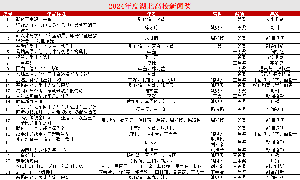 新闻网讯(通讯员周肖)3月10日,2024年度湖北高校新闻奖获奖作品公示,我校共有25件作品获奖,其中一等奖5项、二等奖12项、三等奖8项,获奖总数再创新高。