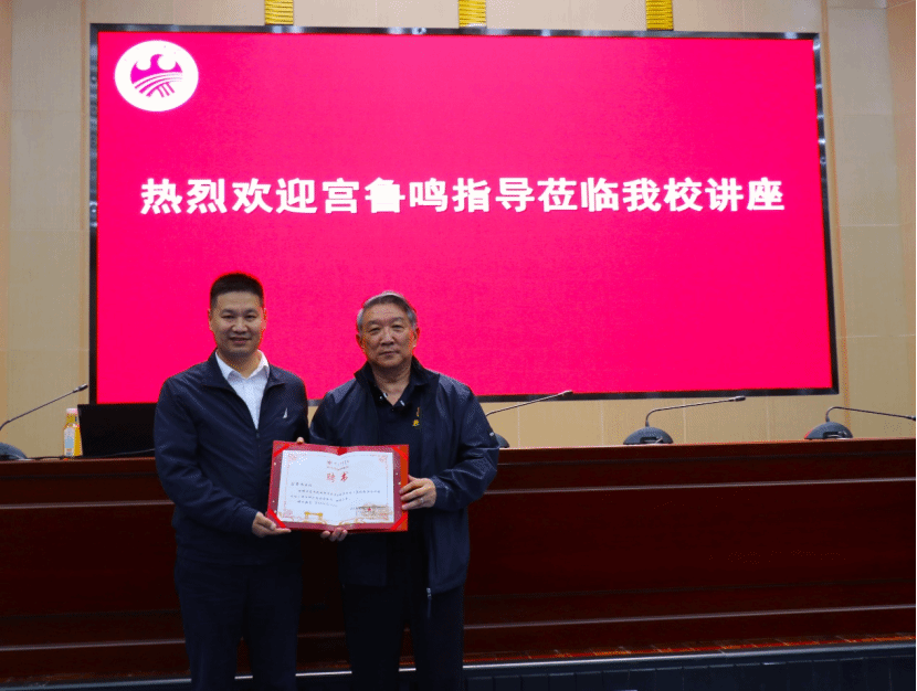 讲座伊始,潘高峰为宫鲁鸣指导颁发武汉体育学院体育教育训练学专业——篮球教学与训练方向硕士研究生导师聘书。