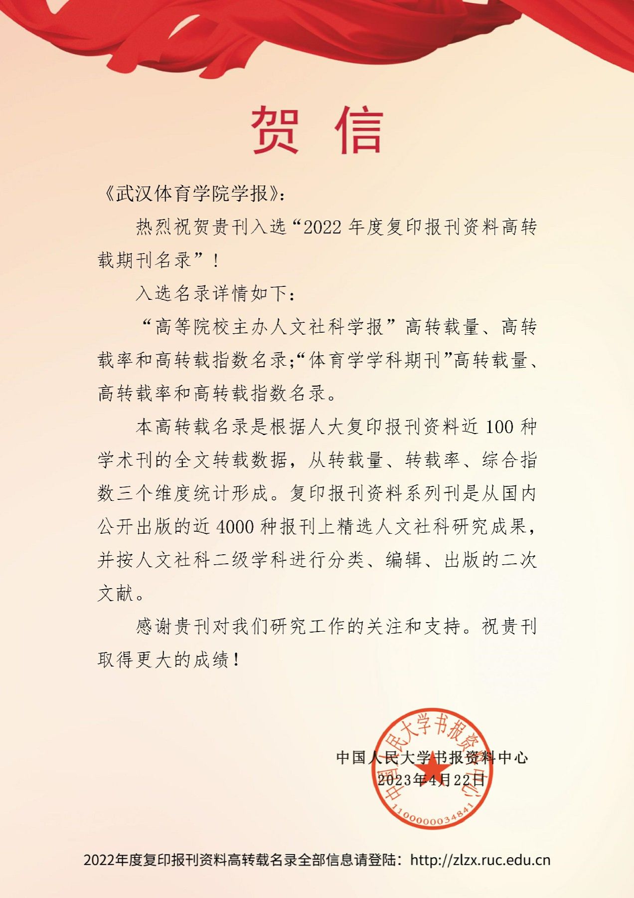 新闻网讯(通讯员游迎亚)近日,在由中国人民大学主办、中国人民大学书报资料中心承办的“2022年度中国人民大学复印报刊资料转载名录发布论坛暨中国自主知识体系建构与学术期刊发展研讨会(2023·北京)”上,发布了《2022年度复印报刊资料高转载期刊、机构名录》和《复印报刊资料重要转载来源作者(2022年版)》两项成果。《武汉体育学院学报》入选“高等院校主办人文社科学报”高转载量、高转载率和高转载指数名录和“体育学学科期刊”高转载量、高转载率和高转载指数名录。