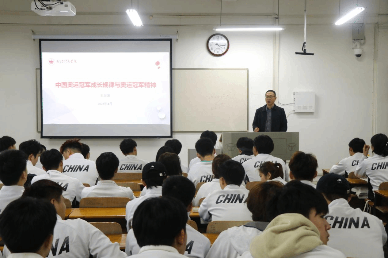 4月3日下午,党委常委、副院长王志强为运动训练学院2021级本科生讲授形势与政策课。他以“中国奥运冠军成长规律与奥运冠军精神”为题,从“奥运冠军精神激发中华民族伟大复兴新动力”“奥运冠军精神引领体育强国建设新征程”“打造新时代中国特色社会主义体育文化品牌”三个维度为同学们讲述了奥运冠军精神。他还结合东京奥运会执裁经历,向同学们传递了奥运竞技项目的文化魅力以及奥运冠军精神的渗透力和影响力,并勉励同学们要知行合一,在学习、生活、工作中践行社会主义核心价值观,自立自省、向上向善,成为父母、学校乃至社会、国家的骄傲。