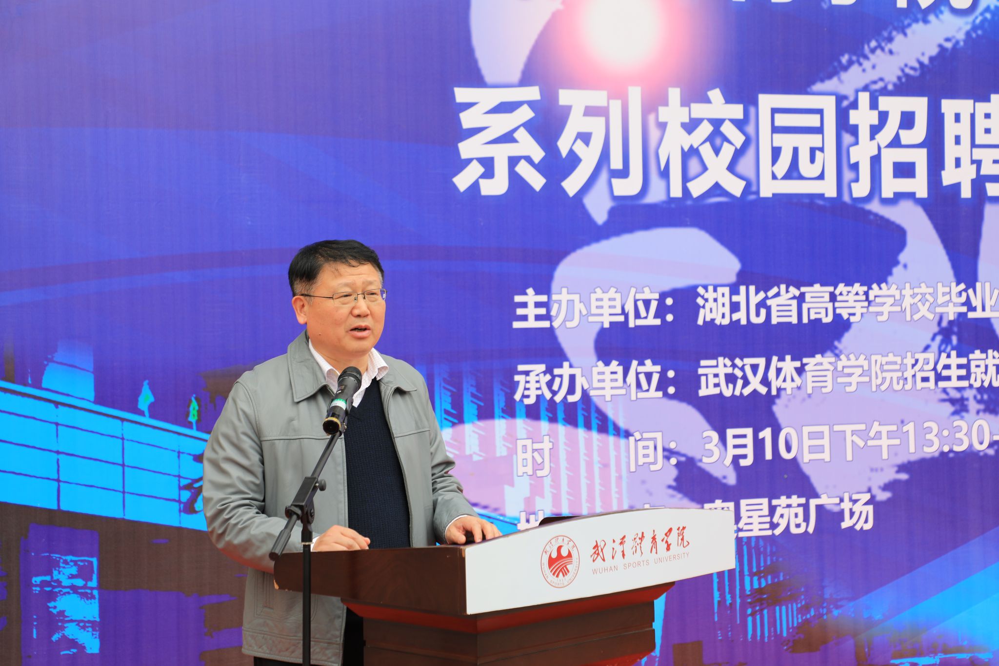 新闻网讯(通讯员高晗)3月10日下午,由湖北省高等学校毕业生就业指导服务中心、武汉体育学院主办,武汉体育学院招生就业处承办的“武动青春 职等你来”2023年武汉体育学院校园系列招聘活动启动式在奥星苑广场举行。党委常委、副院长王志强主持启动式。
