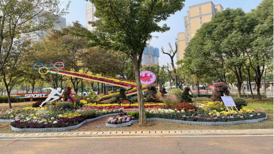 作品《菊韵江城,兴体报国》由我校后勤集团职工用数十种菊花品种精心扎制成花篮形状,形态饱满、色彩丰富、错落有致,花篮周围还别具匠心地以奥运五环、校徽入题,展现了学校鲜明的体育特色与拼搏奋进的姿态。