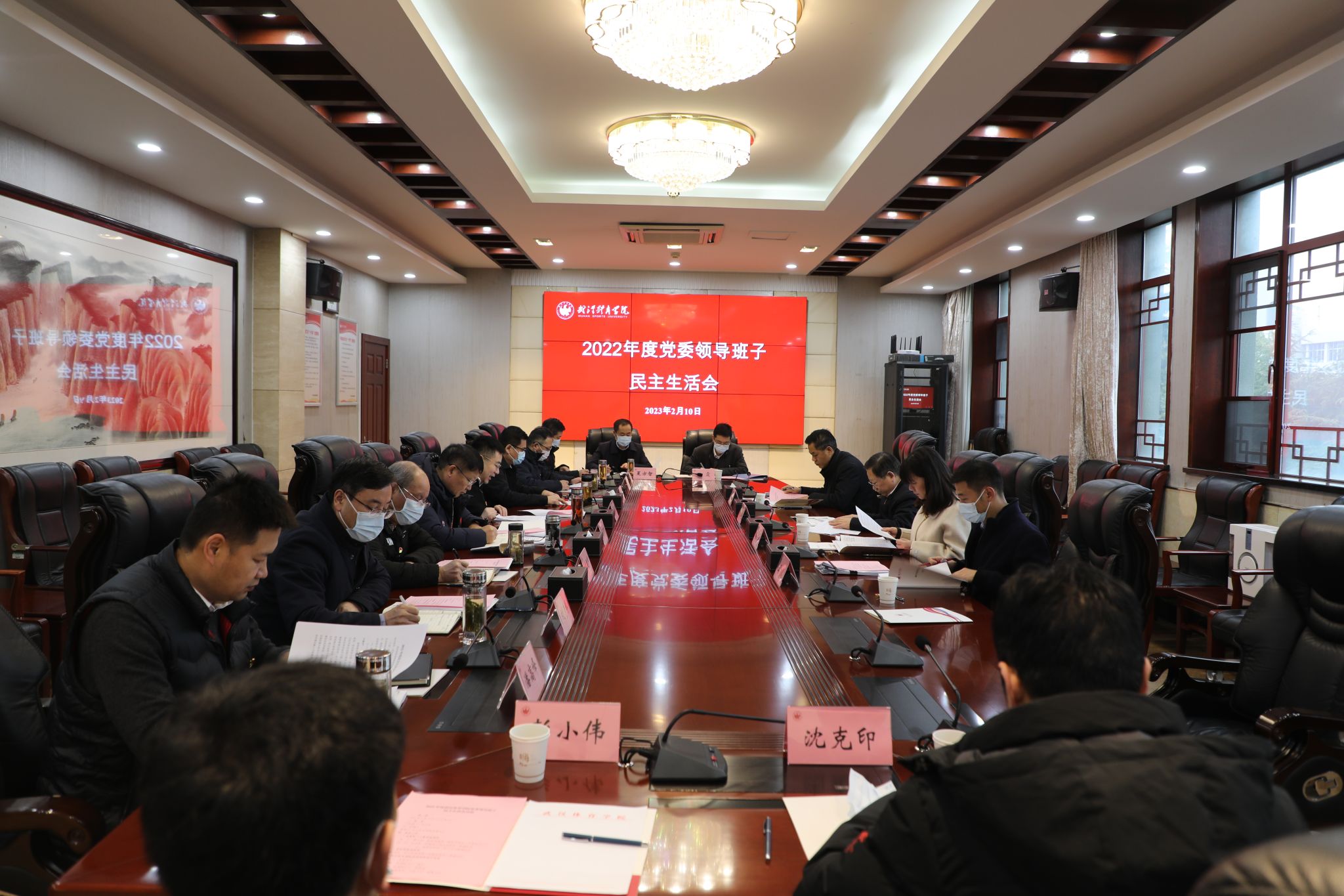 民主生活会紧扣“全面贯彻习近平新时代中国特色社会主义思想,深入贯彻落实习近平总书记关于湖北工作的重要讲话和指示批示精神,深刻领悟‘两个确立’的决定性意义,增强‘四个意识’、坚定‘四个自信’、做到‘两个维护’,团结带领学校广大师生以奋发有为的精神推动党的二十大和湖北省第十二次党代会作出的决策部署在学校落地见效,为全面建成中国前列、世界一流应用研究型体育大学而团结奋斗”的主题进行。