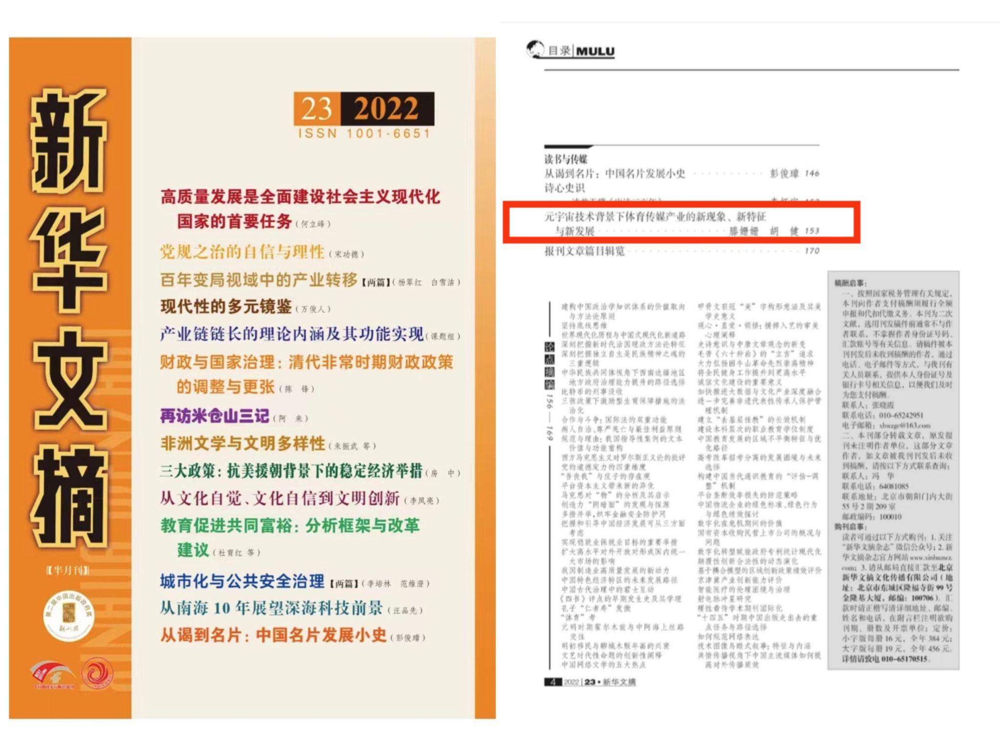 近日,我校新闻传播学院滕姗姗副教授及其研究生胡健共同撰写的学术论文《元宇宙技术背景下体育传媒产业的新现象、新特征与新发展》被《新华文摘》2022年第23期全文转载。
