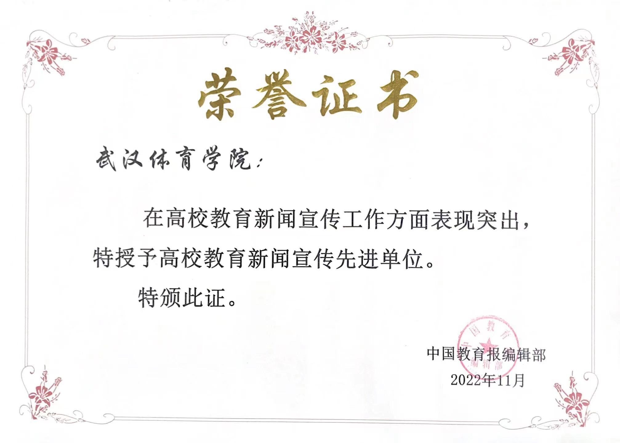 新闻网讯(通讯员张丹)近日,中国教育报刊社发布《关于表彰<中国教育报>湖北高校教育新闻宣传先进单位和优秀通讯员的决定》,我校获评“高校教育新闻宣传示范单位”。