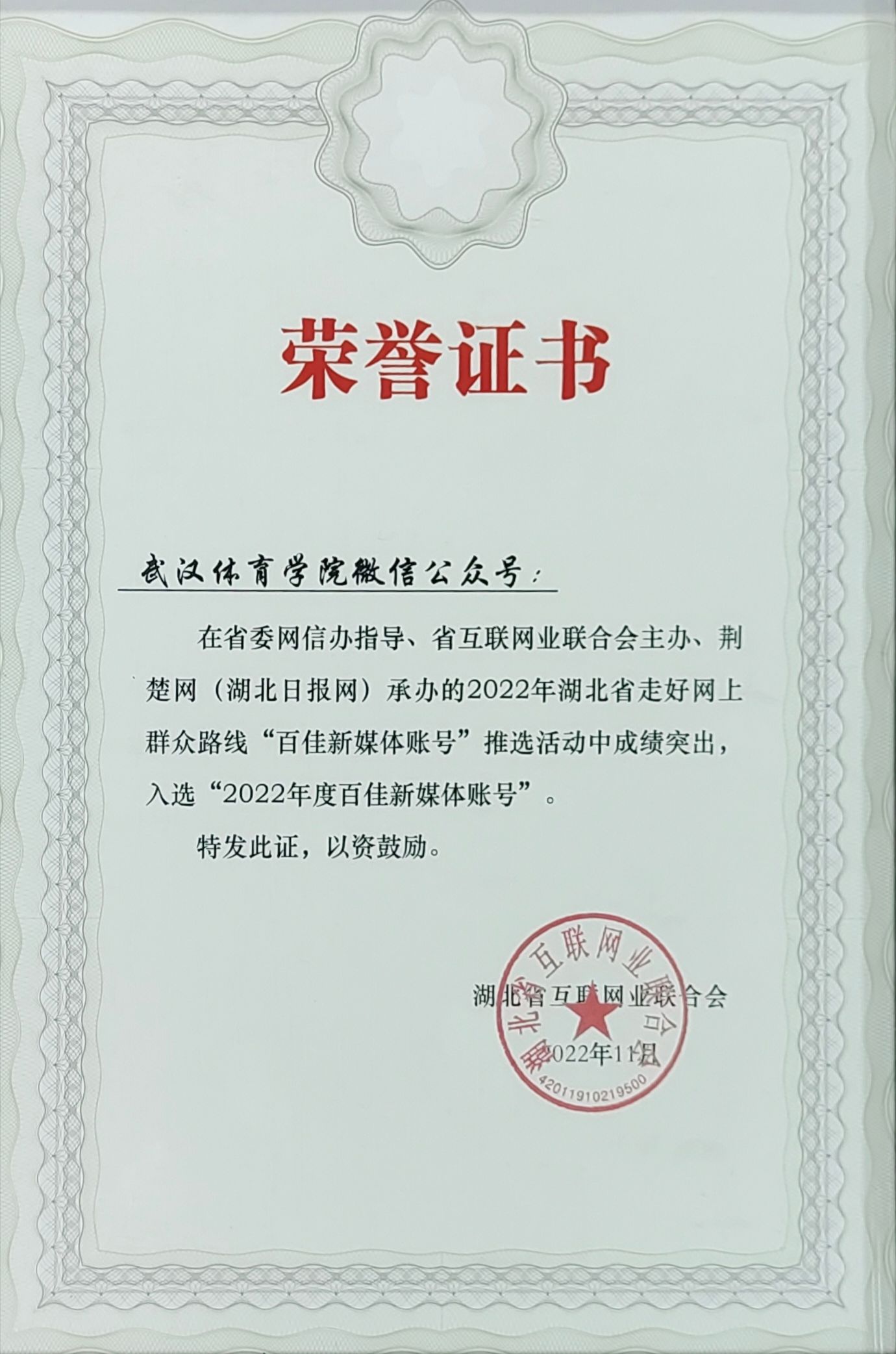 新闻网讯(通讯员李鑫)近日,湖北省委网信办印发《关于表扬走好网上群众路线“百佳新媒体账号”的通报》,对“湖北发布”微信公众号等100个账号予以通报表扬。武汉体育学院微信公众号获评“2022年度百佳新媒体账号”。
