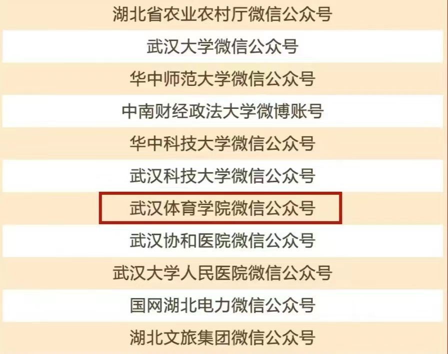 武汉体育学院微信公众号创办于2013年,由党委宣传部负责运营,是学校唯一官方微信公众平台。自创建以来,官方微信坚持以习近平新时代中国特色社主义思想为指导,全面落实立德树人根本任务,牢牢把握网络文化育人主动权,以政治建设为统领,以宣传教育为抓手,以服务师生为宗旨,深入推动“下基层、察民情、解民忧、暖民心”实践活动走深走实。2022年,学校官方微信累计发文300余篇,累计阅读量近300万次,单篇阅读量最高达15万+,总分享数达7万+,多次进入全国百强和全省前十,在全国体育院校官微中位居前列。目前,官方微信粉丝数已近10万,是学校对内对外宣传、发布信息的重要平台,成为讲述武体故事、记录武体发展、传播武体好声音的重要载体。