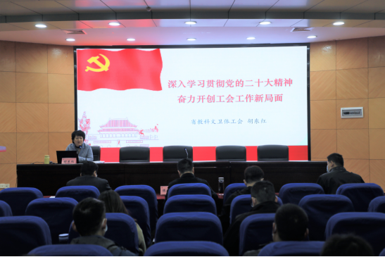 胡东红作题为《学习党的二十大精神,奋力开创工会工作新局面》宣讲报告。她结合学习党的二十大和湖北省第十二次党代会精神,紧紧围绕科教兴国、人才强国、创新驱动发展战略,紧扣新时代工运事业和工会工作新要求,以“学深悟透新思想”和“昂首迈步新征程”两个部分深刻解读党的二十大精神,带领全校工会干部用发展的眼光去审视工会工作、用全局的观念去谋划工会工作、用创新的精神去推动工会工作,为开创学校工会工作新局面指明了方向。