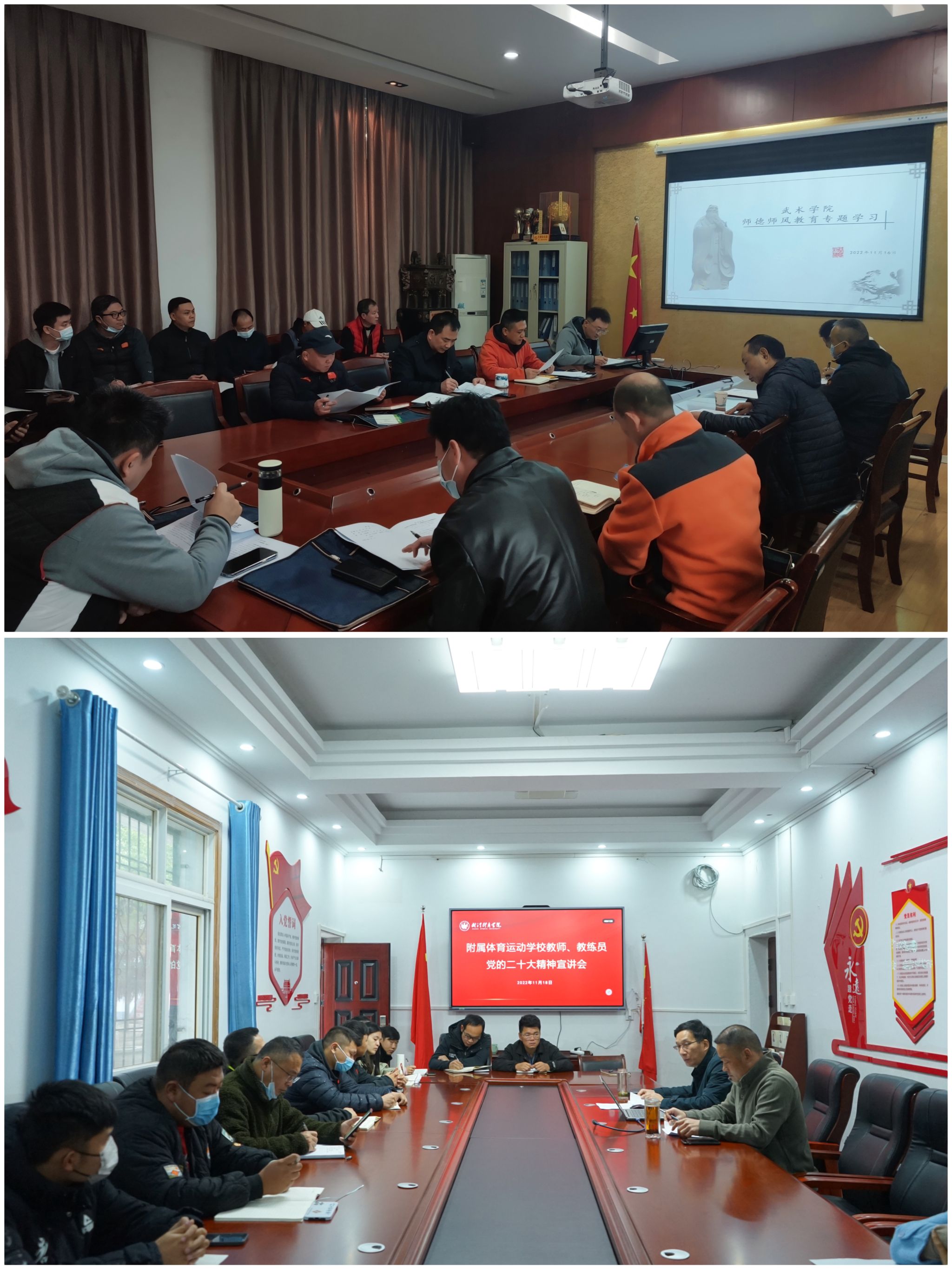 武术学院、马克思主义学院、体育运动学校等单位结合主题党日活动,深入学习党的二十大精神。武术学院组织全院教师召开学习贯彻党的二十大精神专题培训班,将师德师风教育纳入培训环节,更好推动学思践悟,确保学出实效、学以致用。马克思主义学院组织思政课教师开展“冠军中国”集体备课会,推动用党的创新理论铸魂育人,不断增强针对性、提高有效性,实现入脑入心。体育运动学校组织教师深入研学党的二十大精神,切实把学习成果转化为推动工作的强大动力,不断提高自身业务本领,为加快教育强国、体育强国建设贡献应有力量。