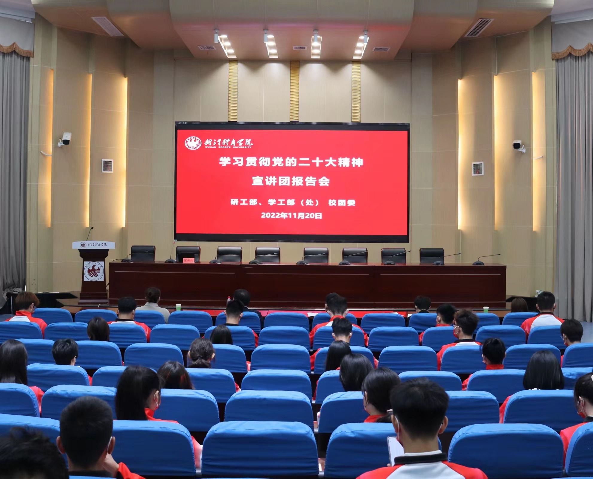 新闻网讯(通讯员康明倩、金梓)11月20日下午,党委研工部、学工部(处)、校团委组织青年骨干宣讲团开展“学习贯彻党的二十大精神”宣讲报告会。青年骨干宣讲团由我校运动训练学院青年教师尹成昕、网球学院辅导员方伟、运动医学院博士研究生梁计陵、体育教育学院本科生马吉、新闻传播学院本科生向可晗组成。