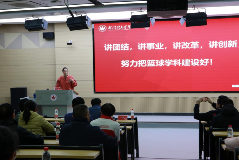 报告中,钟添发对武体篮球学科建设提出了一系列建设性意见:一是发扬团结协作的优良作风,全体武体篮球人要团结一致、勇于改革、敢于创新。二是重视梯队建设,要选好学科带头人,培养有潜力的年轻人,以老带新。三是提高科学研究能力,开展“精英班”模式的有益探索,常态化举办学术论坛活动,提高学生学术能力与水平。四是提高运动技能水平,抓细抓实日常训练,推行篮球比赛制度化,达到“以赛促教”“以赛促练”“以赛促改”的效果。