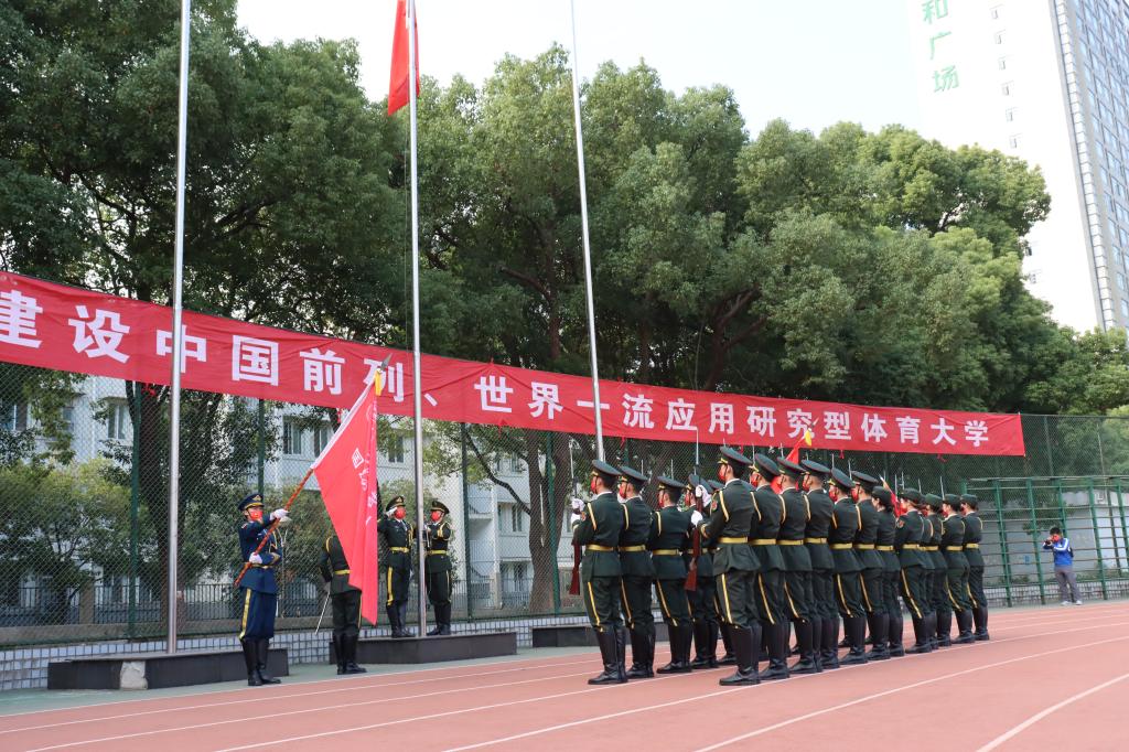 国旗护卫队迈着整齐划一的步伐,护送国旗入场。自信昂扬的步伐、矫健挺拔的身姿、庄严肃穆的神情,展现了我校学子积极向上、昂扬奋发的精神面貌。