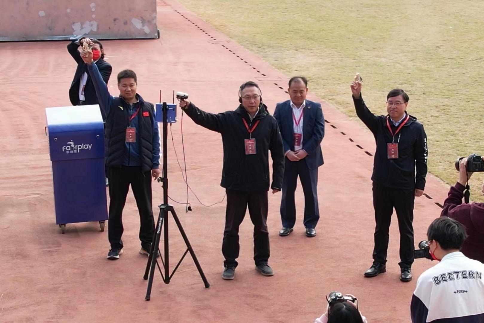 (校领导王志强、刘彦博、潘高峰为运动会鸣枪开赛)