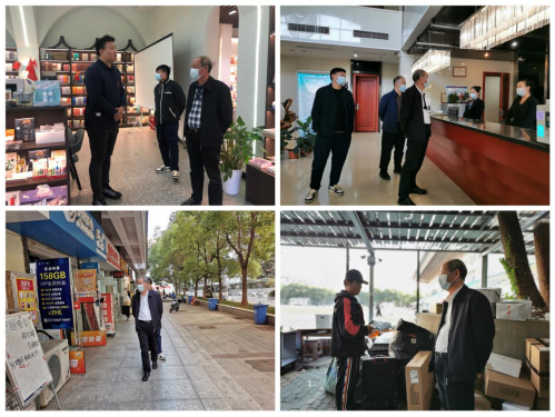 朱建中一行先后走访了社区、家属区、书店、学生食堂、快递点、国际交流中心、校内经营商点、值班值守签到点等重点部位,深入一线实地检查校园疫情防控落实情况,重点询问了解家属区疫情防控、校园出入管理、餐饮服务保障、邮件快递消杀等防疫措施落实情况,并对工作人员口罩佩戴等提出严格要求和防护提醒。