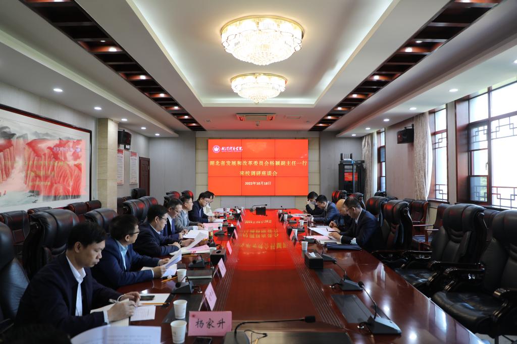 新闻网讯(通讯员张丹)10月18日上午,湖北省发展和改革委员会党组成员、副主任杨颖一行来校调研指导。省发改委社会处、高技术处负责人,校党委书记陈继平,党委副书记、校长吕万刚,党委常委、副校长王志强、刘彦博、朱磊陪同调研。