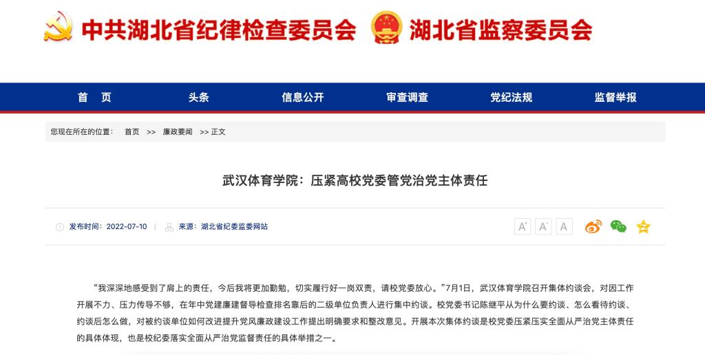 7月10日,湖北省纪委监委网站首页“要闻”栏目以《武汉体育学院:压紧高校党委管党治党主体责任》为题,刊发我校压实管党治党主体责任工作典型做法,现全文转载如下: