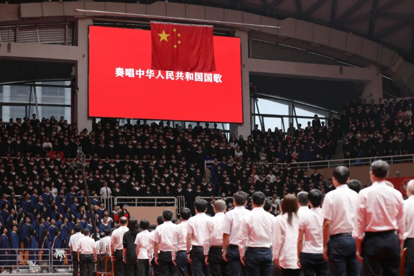 全体起立,奏唱国歌。伴随着庄严肃穆的国歌声,毕业典礼暨学位授予仪式正式拉开帷幕。