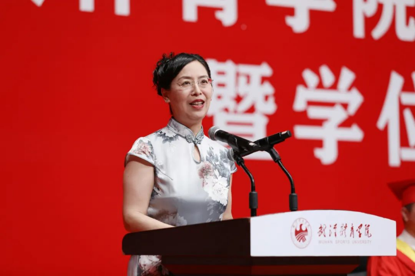 体育教育学院黄莉教授作为教师代表发言,她说,体育不仅给我们带来了多巴胺,也给我们带来了内啡肽,给我们带来了很多快乐。希望同学们不管未来身处逆境还是顺境,都能像夜空中那颗最亮的星,在坚守中闪烁你的光亮和智慧,乘势而上,抓住机遇,撸起袖子加油干!