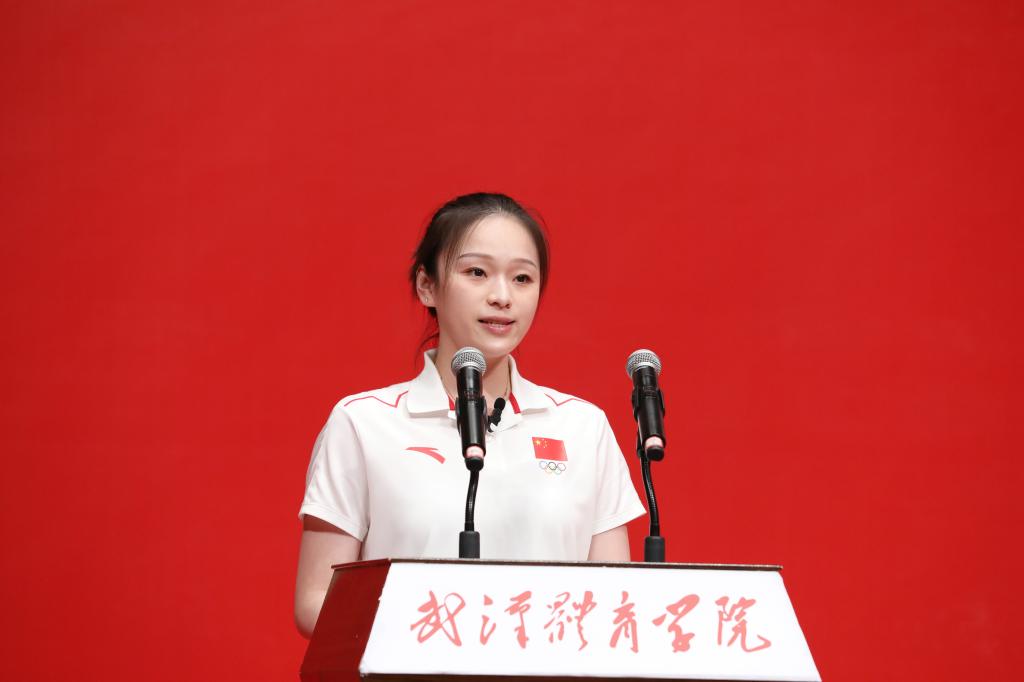 运动训练学院游泳教研室青年教师尹成昕,与毕业生们一起分享了这一路走来的感想,母校学习的经历赋予了她成长的底气和拼搏的勇气,在这里她学到了理论知识,也丰富了人生阅历。从中国国家花样游泳队的一名运动员,到现在的武汉体育学院的一名青年教师,她已经完成了身份的转变。朝夕耕耘,春华秋实,她分享了四句话和所有毕业生共勉:一是要坚定信念,拒绝“躺平”,做一名有责任、有担当的青年人;二是要坚定梦想,学思践悟、脚踏实地,做一个勇于开拓的青年人;三是要坚定奉献,做一个有大局观,甘当贡献青年人;四是要坚定“更高 更快 更强 更团结”的意识,做一个敢于拼搏、勇于争先的青年人。