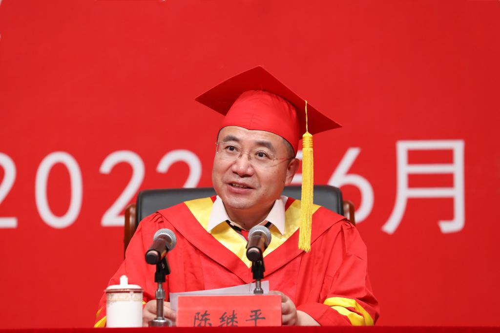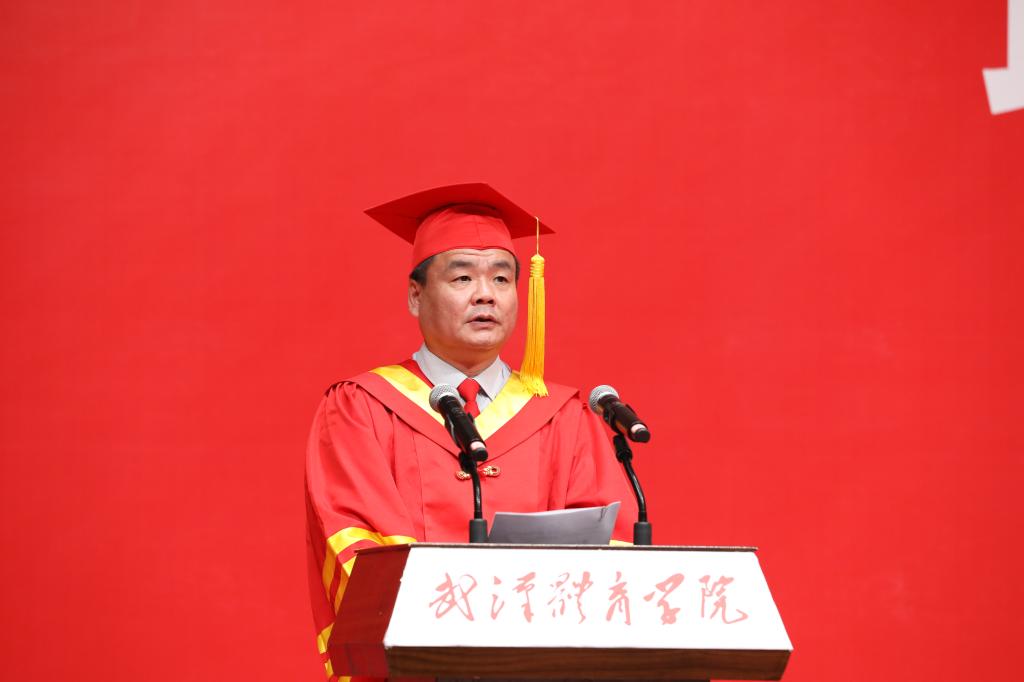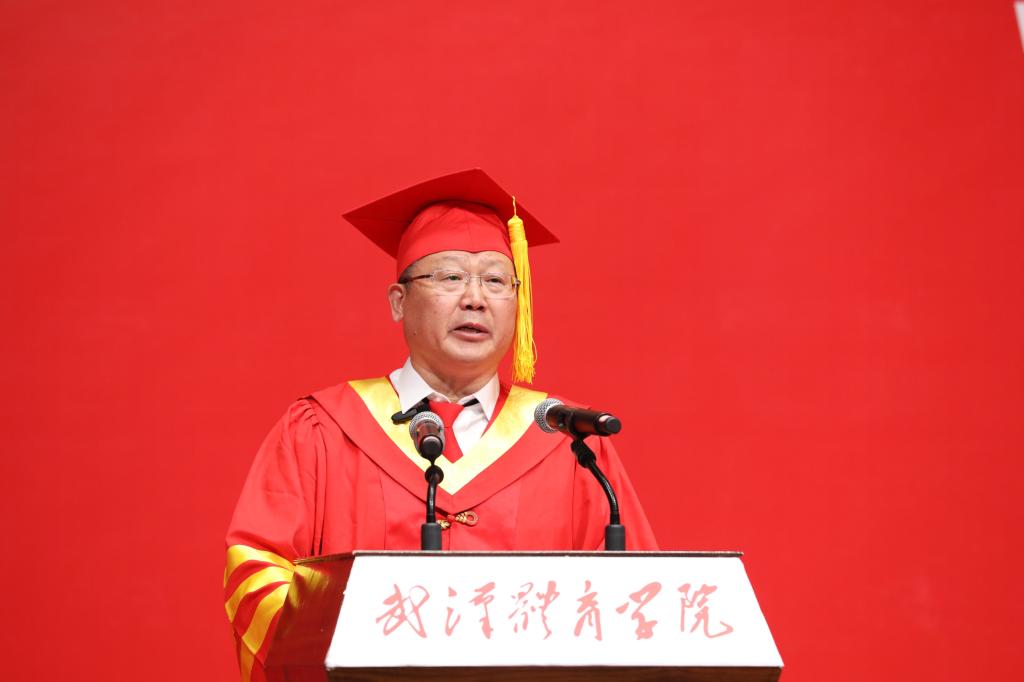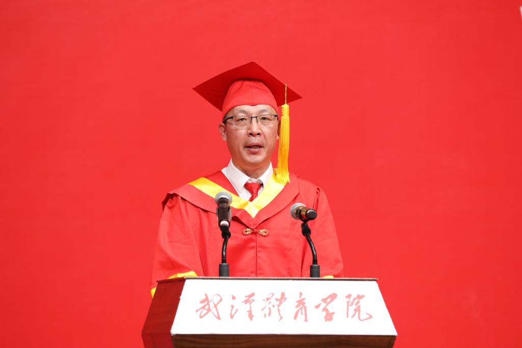 吕万刚向2022届学生圆满完成学业表示衷心祝贺,也向同学们的师长和家人表示衷心的感谢,他说:“四年校园生涯,你们不畏艰难,经历了学业、思想、生活的磨练和考验,克服了疫情带来的巨大困难和压力,顺利完成了学业,学校为你们感到骄傲。每一位毕业生都在武体挥洒了青春汗水,留下了拼搏印记,创造出了属于自己的精彩;在家国使命中展现了武体担当,你们用实际行动诠释了责任,用拼搏彰显了武体精神,发出当代中国青年内心的最强音。因为有你们,学校深感幸运;因为有你们,学校倍觉荣光。”
