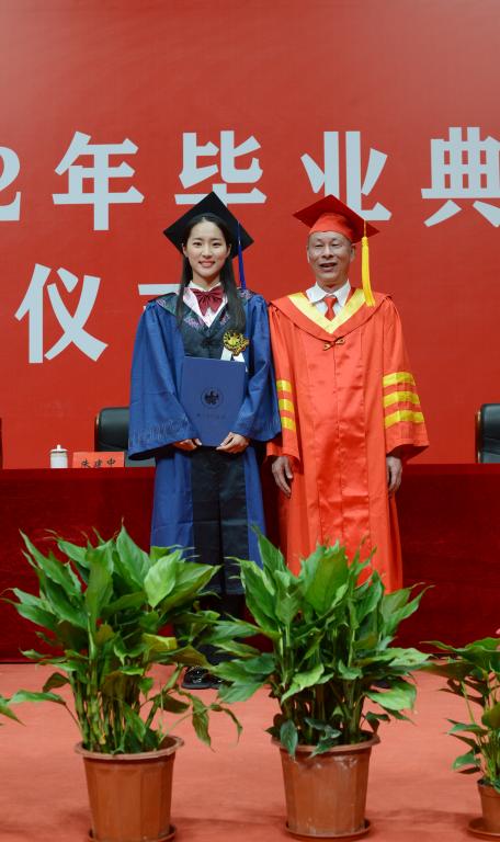 校领导为优秀毕业生代表颁发奖杯、荣誉证书并合影留念。