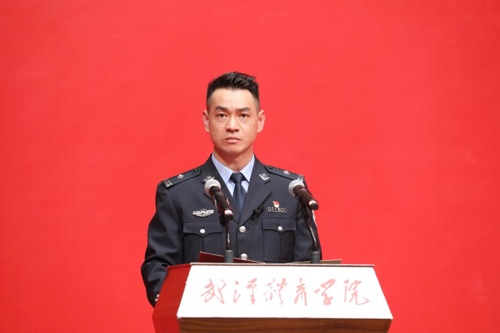 武汉体育学院武术系1999级民族传统体育专业的毕业生、武汉市公安局特警支队四大队(猛士突击队)党支部书记、大队长周丹作为校友代表发言。他回顾了母校对他悉心培养。周丹表示,在武体度过的四年使自己练就了过硬本领,“公勇诚毅,学思辨行”的校训哺育滋养了自己,这八个字早已成为深深的烙印,刻在了他的人生信条上。周丹希望同学们胸怀“国之大者”,担当使命任务,到新时代天地中去施展抱负,让青春在祖国和人民需要的地方绽放绚丽之花,全力以赴地走好每一步,不负母校之培养,不负国家之期望。