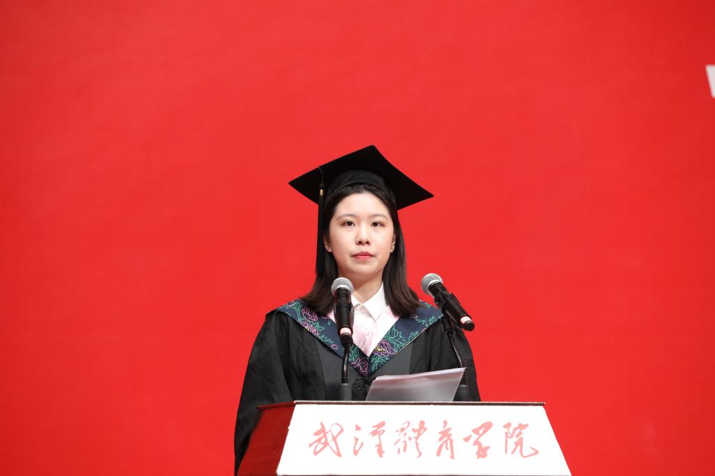 2018级新闻传播学院的周㑇代表本科毕业生发言。本科四年,周㑇不断在探索中寻找前进的方向,并不断锤炼本领。“感谢武汉体院为我带来的时代之课、志愿服务之课以及思政之课,这些让我有了栉风沐雨的奋斗、奋楫笃行的勇毅和独当一面的能力,为我美好的未来插上丰盈的翅膀。”她回顾了四年大学生活的点滴,表达了将秉承校训精神,在未来书写下属于武体人的华丽篇章,向学校和国家交出无愧于时代答卷的决心。