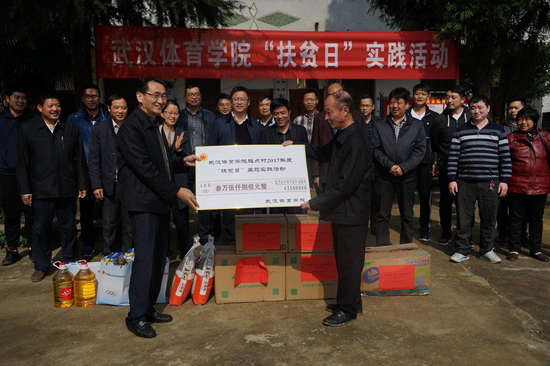 时值党的十九大胜利召开及全国第四个“扶贫日”到来之际,党委书记彭道海将各基层支部、党员捐赠的35800元扶贫资金捐赠给方岗村,用于支持村油茶基地建设,从而拉开了武汉体育学院“扶贫日”系列活动的序幕。
