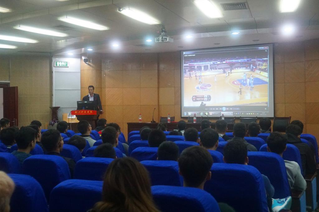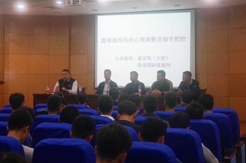 受聘仪式后,温克明大校结合自己在行业中多年工作经验为体教和运训专业师生奉上了一场以“篮球裁判员的心理调整及细节把控”为主题的讲座,介绍了当前国内国际上篮球裁判这一职业供不应求的供需情况,分析这一专业光明的就业前景,就成为优秀篮球裁判员的关键要素和措施谈了个人观点,强调坚持信念的重要性,并以去年的两场比赛为例向同学们传达公平果断的执裁关键。