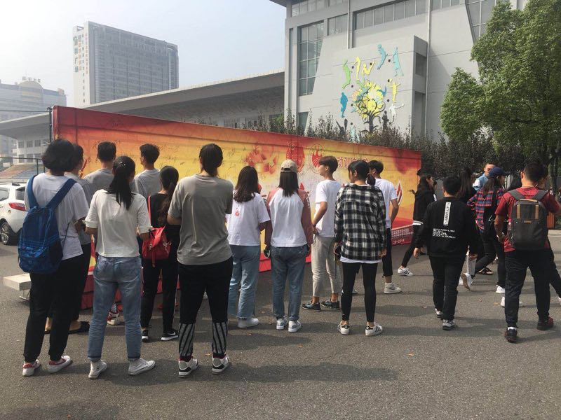 “我想签名,请给我一支笔。”“请问一下我可以代签吗?我的室友中午有事来不了,所以特别嘱咐我帮他签名……”10月9日至12日,武汉体育学院西田径场一侧人头攒动,路过的师生纷纷提笔在“喜迎十九大 为青春建功”的红色展板上签下了自己的名字,标志着运动训练学院开展的“喜迎十九大 为青春建功”系列活动拉开了帷幕。