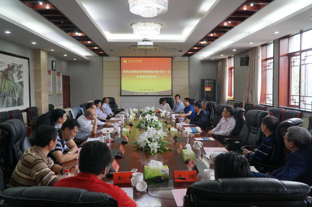 10月10日上午,南京体育学院党委书记朱传耿一行来校考察交流,学校召开座谈会,校党委书记彭道海、党委副书记易三平出席会议,校办公室、组织部、学工部、科研处、人事处、教务处、研究生部等单位负责同志参加座谈会。座谈会由副校长王志强主持。