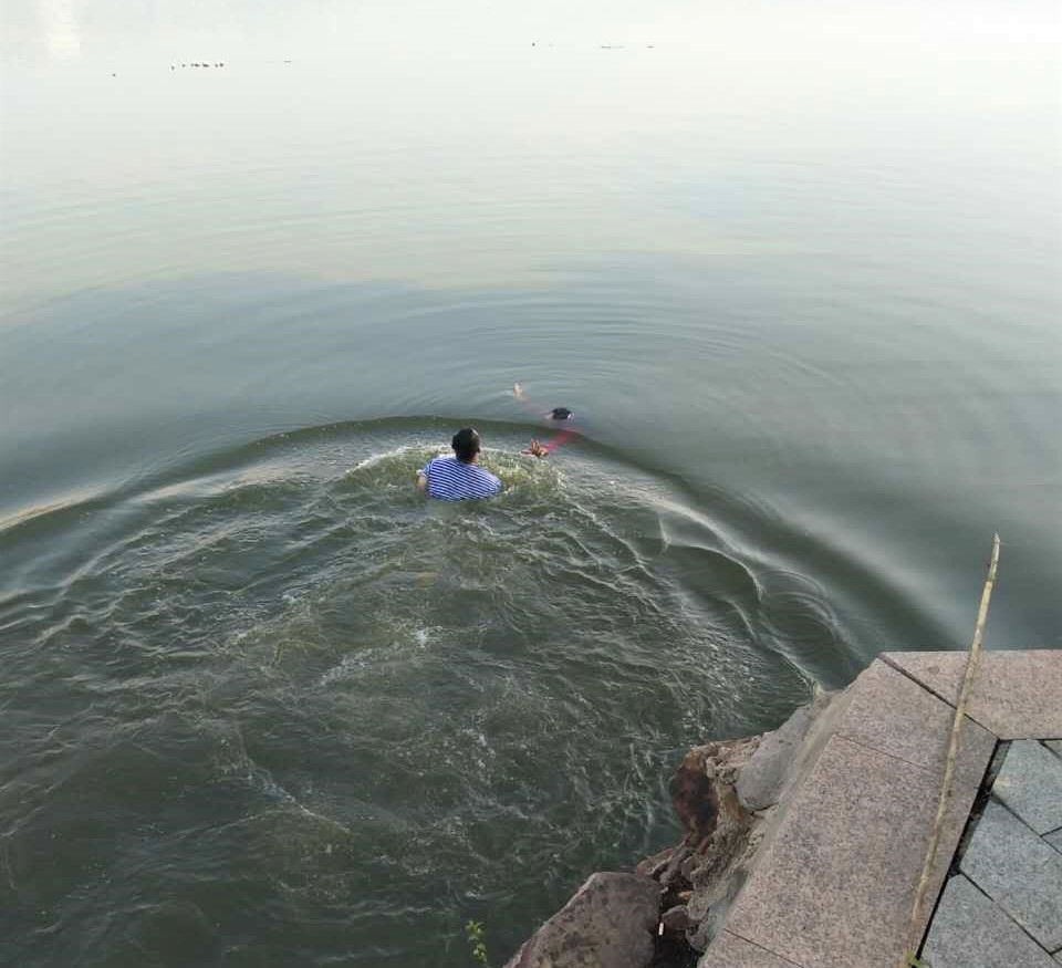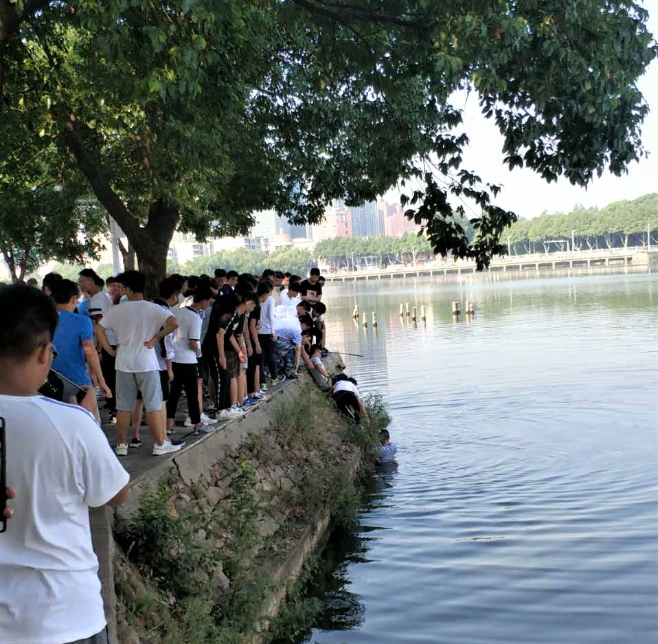 此时,正在带领武汉体育学院2017级新生开展日常军训的十三连教官颜清听到呼救后立刻循声冲了过去,发现一名女子的头已经没入湖中,只留了一双手在水面上,眼看着就要沉下去了。他来不及思考,立刻脱掉外衣和鞋,跳入湖中向落水者游去。