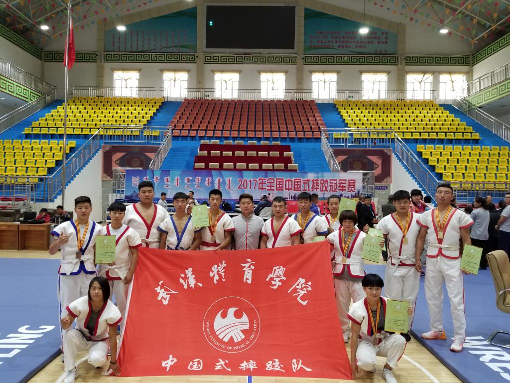 8月25日—27日,2017年全国中国式摔跤冠军赛在内蒙古西乌旗举行。我校中国式摔跤队参赛运动员敢打敢拼、奋勇拼搏,收获了4金3银2铜,团体总分位居第一。