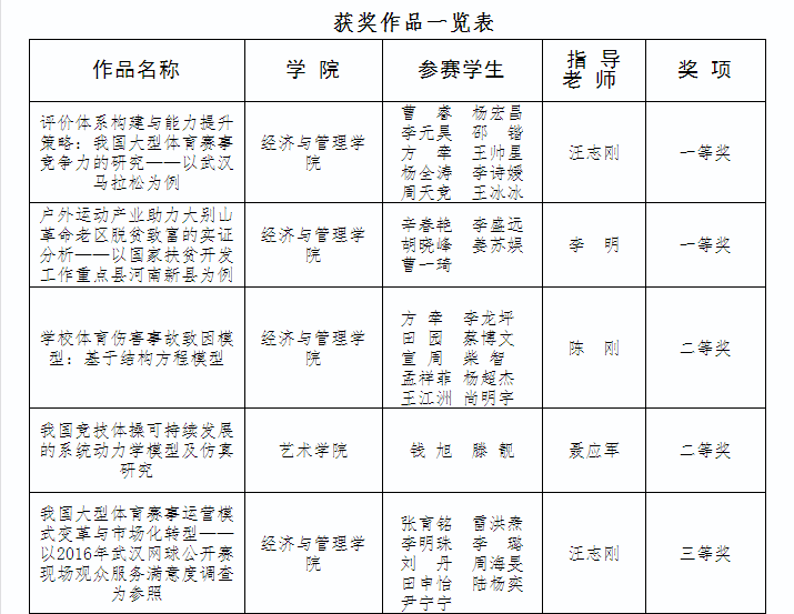 由我校经济与管理学院李明老师指导的“户外运动产业助力大别山革命老区脱贫致富的实证分析——以国家扶贫开发工作重点县河南新县为例”和经济与管理学院汪志刚老师指导的“评价体系构建与能力提升策略:“我国大型体育赛事竞争力的研究——以武汉马拉松为例”获得一等奖。