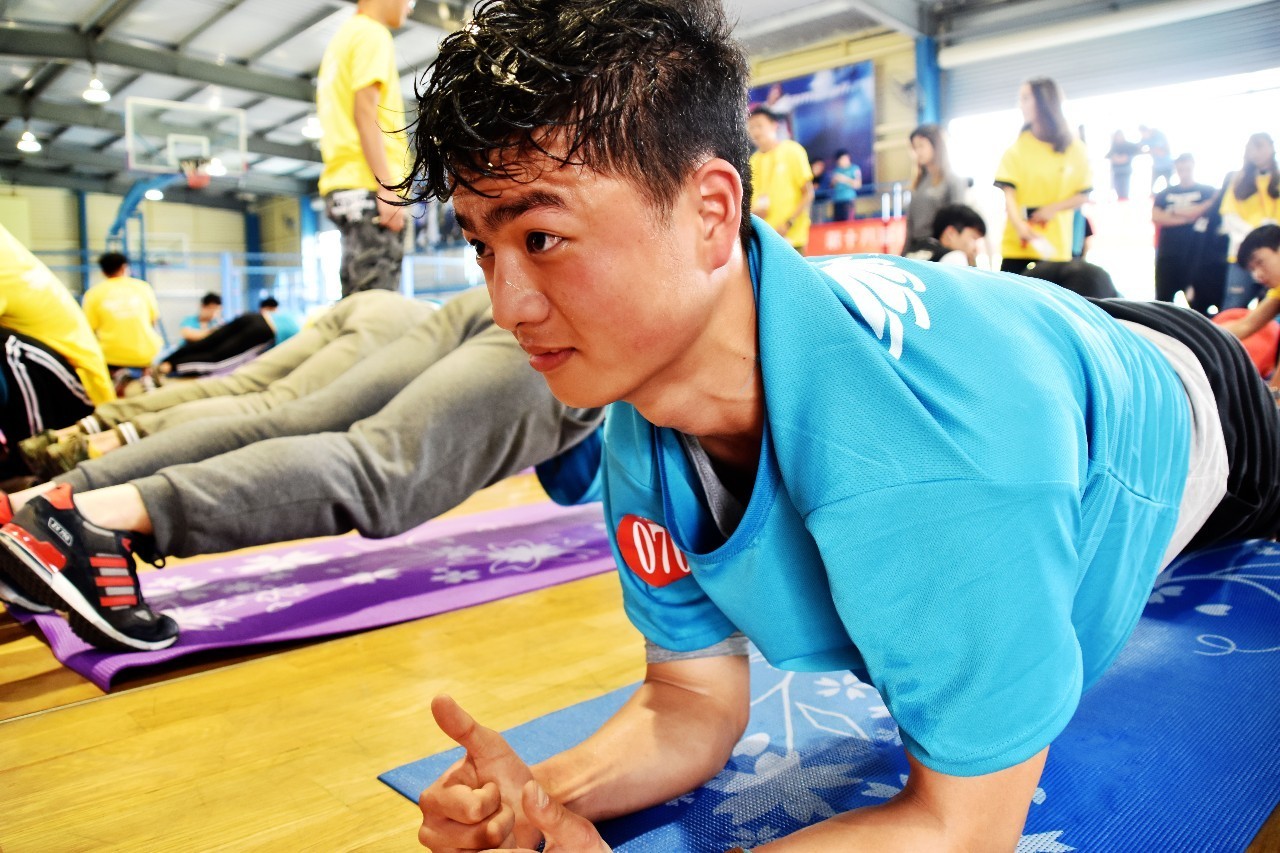 为庆祝中国共产主义青年团成立95周年,经各学院选拔推荐,本次比赛特召集95名选手参赛。经工作人员引导选手入场,主持人宣布比赛规则,裁判员代表宣誓后,比赛正式开始。平板支撑是现当代风靡全球的一项健身运动,已引领了健身的新热潮,被公认为训练核心肌群的有效方法。做这项运动时,身体需要保持直线,手肘完全贴靠地面且肩膀超过手肘,同时保持臀部不能超过肩部,双脚距离与肩同宽。看似简单,但操作起来不易。比赛中,选手们都发挥出了自己最大的实力,不断突破自己,即使浑身颤抖、汗流浃背,仍咬牙坚持着。激烈角逐后,最终产生男子前八名和女子前四名。