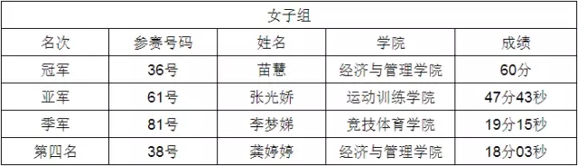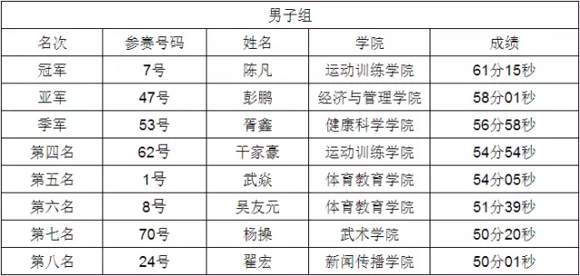 最终,来自运动训练学院的陈凡以1小时1分钟15秒的成绩打破历届最高纪录并夺得男子组冠军,来自经济与管理学院的苗慧以1小时破纪录的成绩获得女子组冠军。