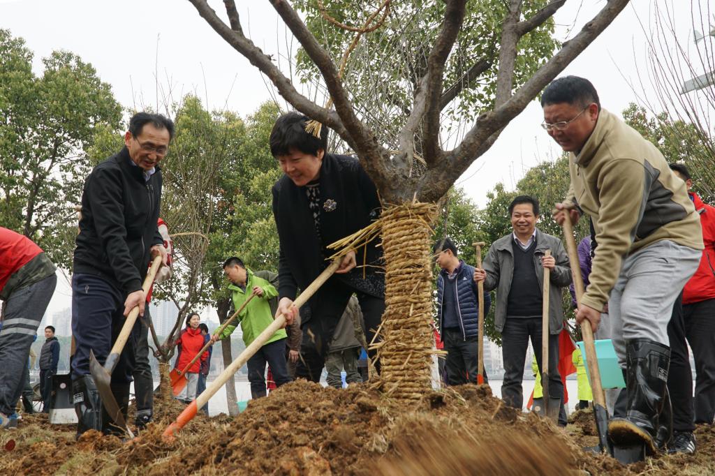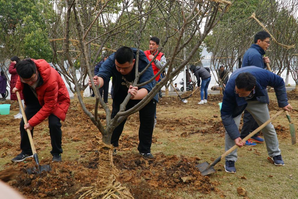 3月10日上午,学校东湖边人头攒动,校领导彭道海、吕万刚、徐屏带领各职能部门负责人、部分青年志愿者在这里开展校园植树活动。