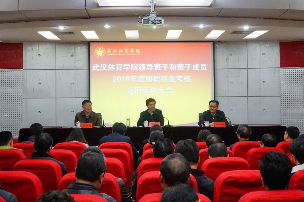 彭道海代表学校领导班子作述职述廉报告。他汇报了学校领导班子2016年严守党的政治纪律和政治规矩、强化工作作风建设、引领意识形态工作、抓好基层组织建设、落实“两个”责任、督查履职尽责工作、加强学科顶层设计、注重人才队伍建设、提升教育教学质量、促进科研提档升级、保持竞技体育优势和特色、关注民生工程等12个方面的履职尽责情况,总结了工作中存在的不足,并结合学校发展实际,对领导班子提出了2017年的改进措施。