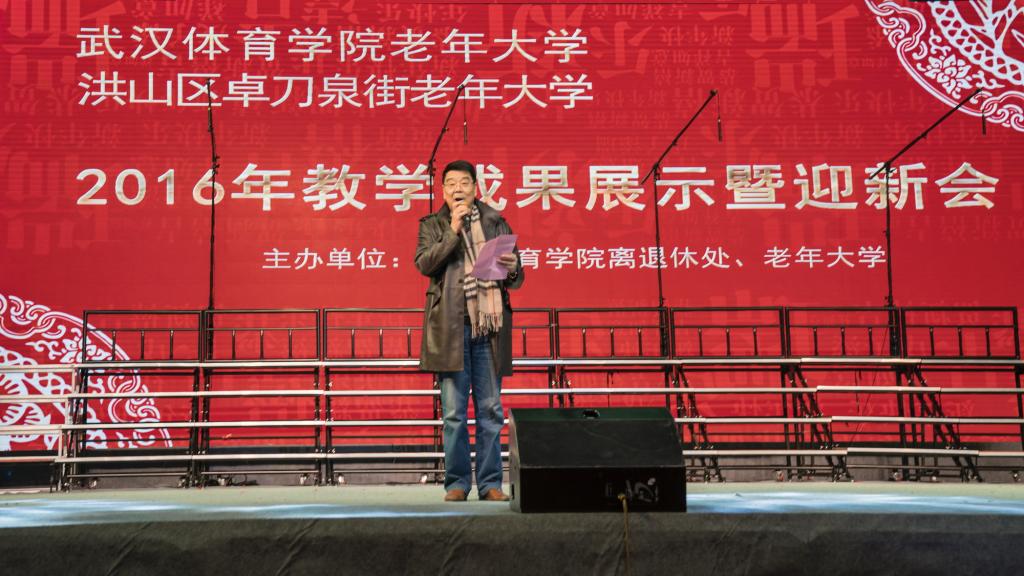 12月26日上午,武汉体育学院老年大学、洪山区卓刀泉街老年大学2016年教学成果展示暨迎新会在我校体育馆隆重举行。