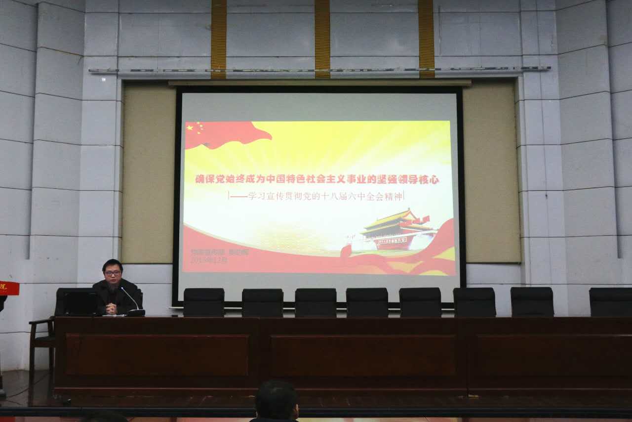 姜劲晖以《确保党始终成为中国特色社会主义事业的坚强的领导核心》为题,紧密围绕习近平总书记在党的十八届六中全会上的重要讲话和全会审议通过的《关于新形势下党内政治生活的若干准则》《中国共产党党内监督条例》,从充分认识党的十八届六中全会的重大意义、深刻理解加强和规范党内政治生活的内涵要求等方面,深入解读了党的十八届六中全会的主要内容和精神,以及《准则》《条例》的基本精神和要求。报告语言丰富、内容详实,具有很强的政治性、理论性、针对性和指导性。