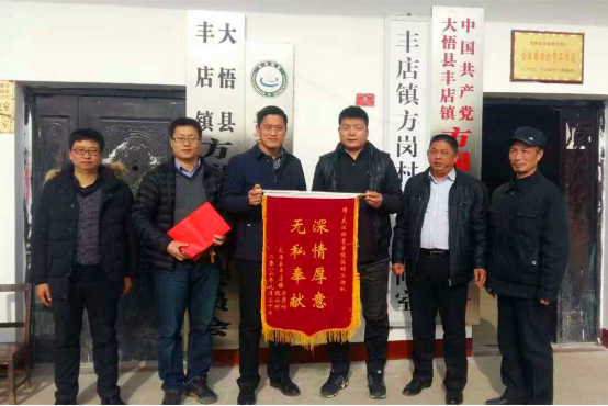 新建通组公路4公里、维修当家塘4口、堰5处,渠道3000米、恢复水毁工程8处、新开挖核桃基地500亩、油茶基地300亩……这些都是大悟县丰店镇在我校开展精准扶贫工作一年期间产生的变化。12月7日上午,省委组织部领导来我校对驻村队员进行了考核,大悟县丰店镇镇长潘攀等一行三人将一面写有“深情厚谊,无私奉献”的锦旗送到我校,对我校派出的驻村队伍高治等同志为丰店镇的经济发展和生活生产问题所付出的努力表示衷心的感谢。