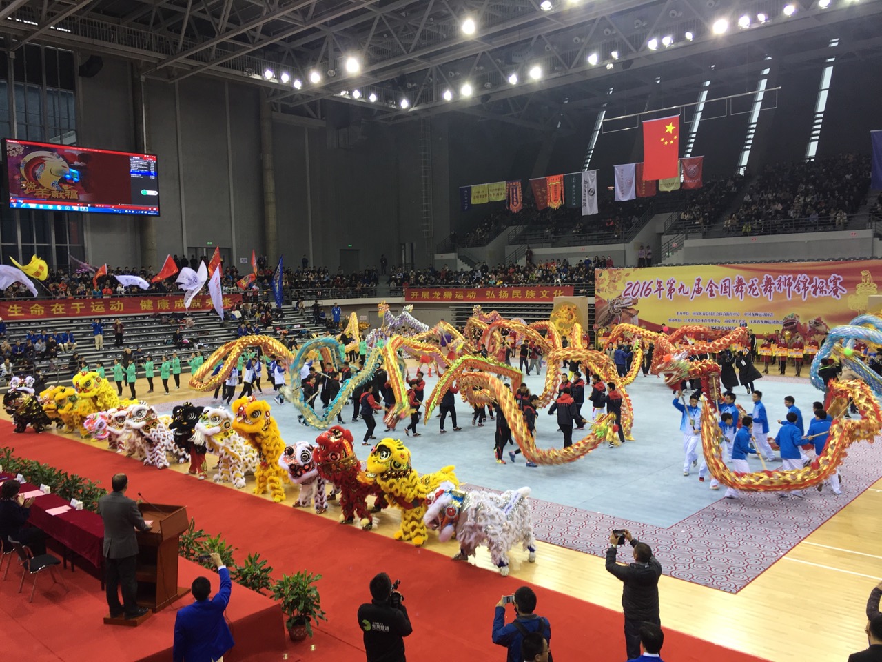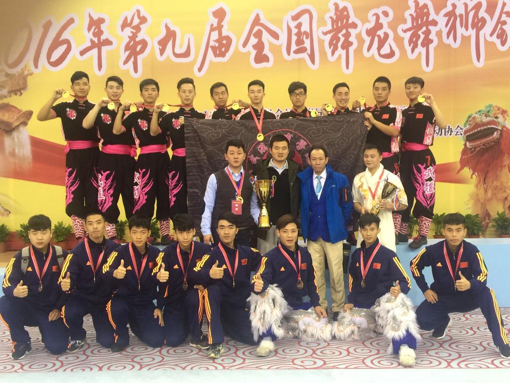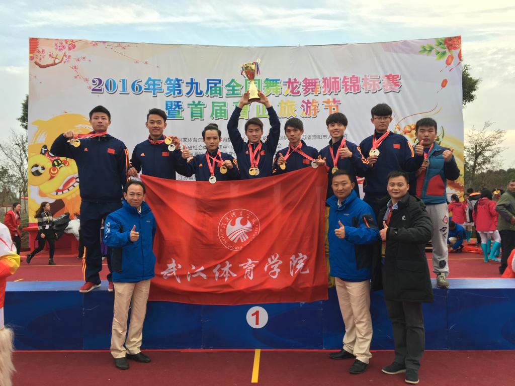 2016年第九届全国龙狮锦标赛比赛于11月24日至30日与江苏省举行,我校组队参加了此次比赛。其中,王圣焘老师率领北狮队获得规定项目第一名、竞速项目第二名;梅博威老师带领舞龙队获得自选项目第一名,障碍项目第一名;赵连文老师带领南狮队获得规定项目第三名、自选项目第四名的优异成绩,继续保持了武汉体育学院在全国该项目中的优势地位。