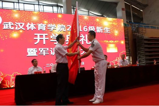 随后,党委书记彭道海授军训团团旗,军训团团长左超接旗。