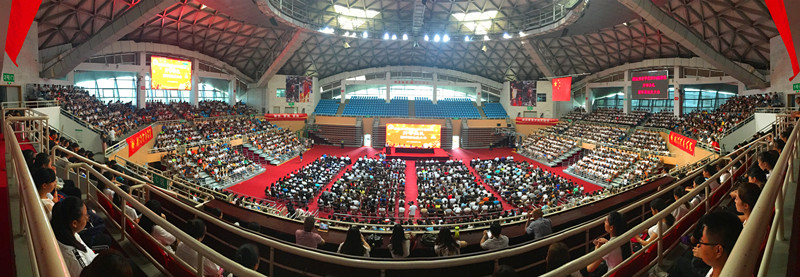 9月12日上午8点,在雄壮的国歌声中,2016级新生开学典礼暨军训动员大会在学校综合馆举行,校党委书记彭道海给全体新生讲授了开学第一课。校领导、各职能部门负责人、各学院党政主要负责人、新生辅导员、教师代表、全体新生和家长代表出席典礼。