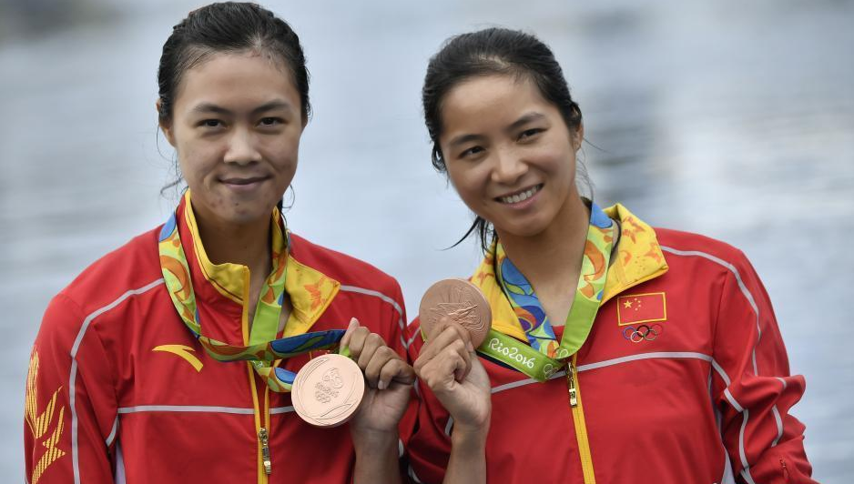 | 我校2013级运动训练专业学生黄文仪(左1)与队友潘飞鸿为中国代表团获得本届奥运会的首枚赛艇奖牌 |
