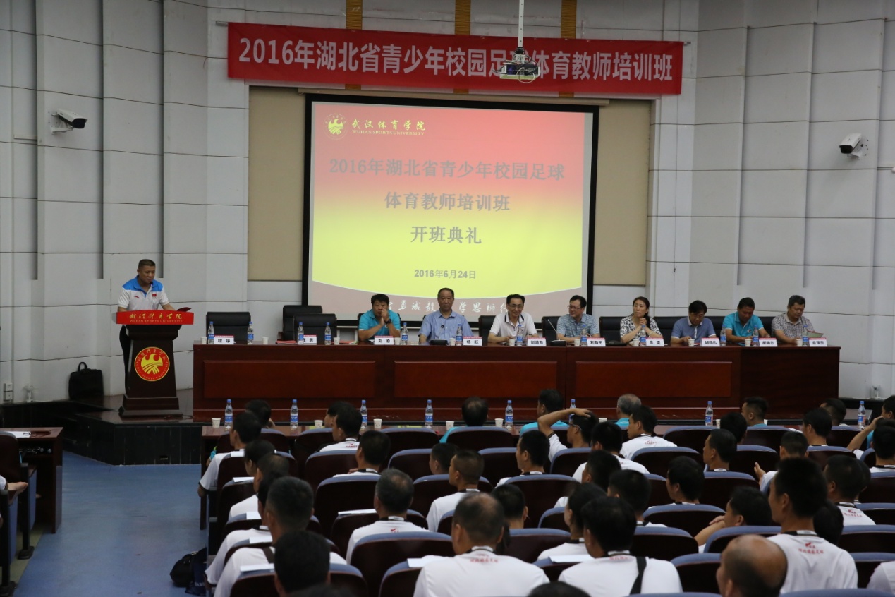 6月24日上午8:30,由湖北省教育厅主办,武汉体育学院承办的2016年湖北省青少年校园足球体育教师培训班在东教学楼第三报告厅开班。武汉体育学院党委书记彭道海、教育部体卫艺司体育处处长刘海元、省教育厅体卫艺处处长杨跃、省体育局青少处处长余雯、省足球管理中心副主任陈勇、洪山区教育局副局长胡明礼及全体授课教师出席开班典礼,开班仪式由武汉体育学院竞赛与场馆中心主任程序主持。来自湖北省17个地市州的254名足球专项体育教师参加培训。