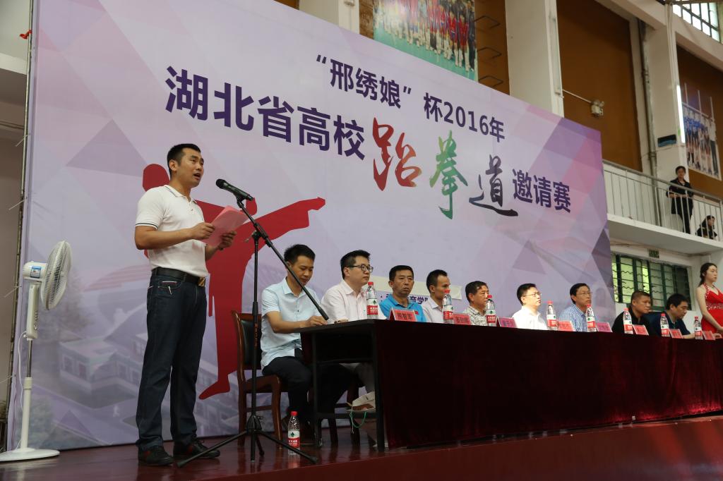 6月11日上午,邀请赛开幕仪式在校综合馆举行,湖北省教育厅体卫艺处副处长缪胜杰,湖北省大学生体育协会副秘书长、竞赛部长沈传茂,武汉体育学院运动训练学院院长邹克宁,本次比赛仲裁主任曾于久,武汉市公安局经侦支队政委金红焰,武汉体育学院宣传部部长姜劲晖,武汉体育学院竞赛与场馆中心主任、湖北省大学生体育协会竞赛部副部长程序,武汉体育学院保卫处处长耿保民,湖北省邢绣娘生物科技股份有限公司董事长熊智军,武汉体育学院运动训练学院跆拳道教研室主任杜七一出席开幕仪式,武汉体育学院校长助理、院办主任易三平致欢迎词。武汉体育学院运动训练学院庞俊鹏老师主持开幕仪式。