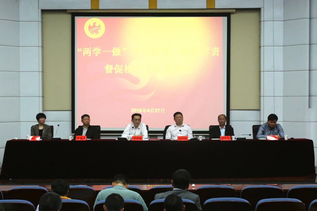 党委书记彭道海对开展两项工作提出具体要求。他指出,各个单位要紧密结合学校实际,把“两学一做”学习教育和履职尽责督促检查工作结合起来,引导全体党员积极争当“四讲四有”党员,把学习教育的成效体现到推动学校发展的方方面面;同时运用好督促检查结果,努力营造依法治校、主动作为、廉洁高效的发展环境,为实现学校“十三五”事业发展开好局。他强调,党员领导干部要做好学习的表率,逐条逐句通读《党章》、《中国共产党廉洁自律准则》和《中国共产党纪律处分条例》,养成纪律的自觉、守住做人做事的底线;要做好行动上的表率,踏实做好本职工作,全心服务于学校师生,发挥党员示范带头作用;做好作风上的表率,狠抓工作作风、思想作风和领导作风建设,充分发扬民主,公开党务政务,让权力在阳光下运行;做好守则守纪的表率,把广大师生利益放在心上,严格要求自己,管好身边人。